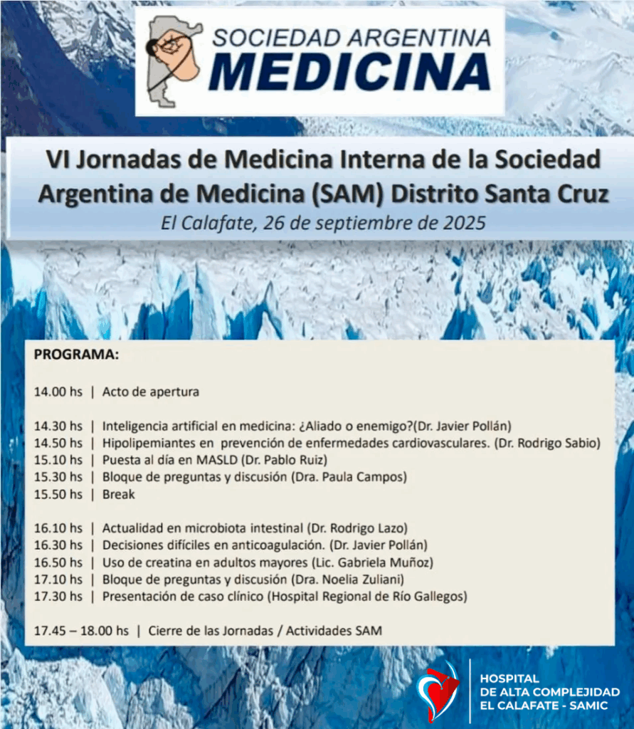 El próximo viernes 26 de septiembre, nuestro hospital será sede de un encuentro científico de gran relevancia: las VI Jornadas de Medicina Interna de la Sociedad Argentina de Medicina (SAM) – Distrito Santa Cruz.